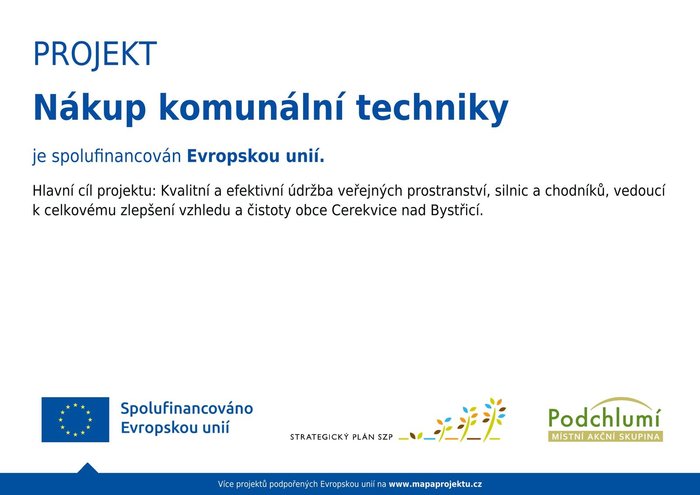 Státní zemědělský intervenční fond ČR prostřednictvím 1. Výzvy SP SZP MAS Podchlumí, z.s. schválil poskytnutí dotace na projekt s názvem „Nákup komunální techniky“.