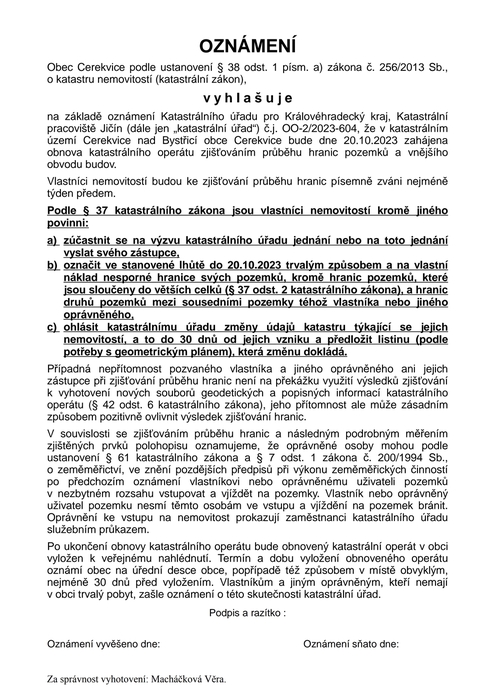 Příjemce dotace: obec Cerekvice nad Bystřicí